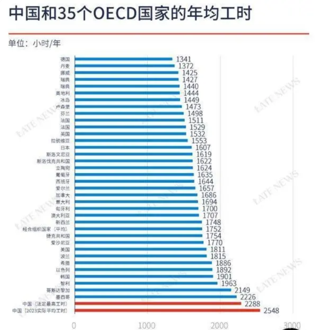 而在今年一月份公布的35个国家年平均工时排名中,中国又以2548的人均年工时“遥遥领先”。