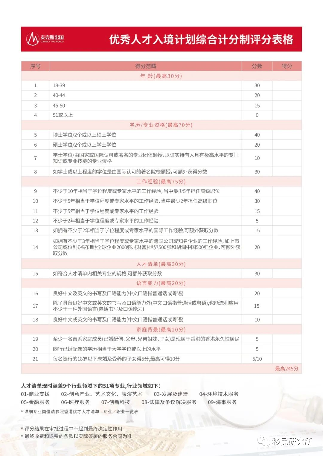 第二、对申请人的年龄、学历、工作经验等等维度进行打分,满分245分,80即可递交申请,120分以上才有概率获批。