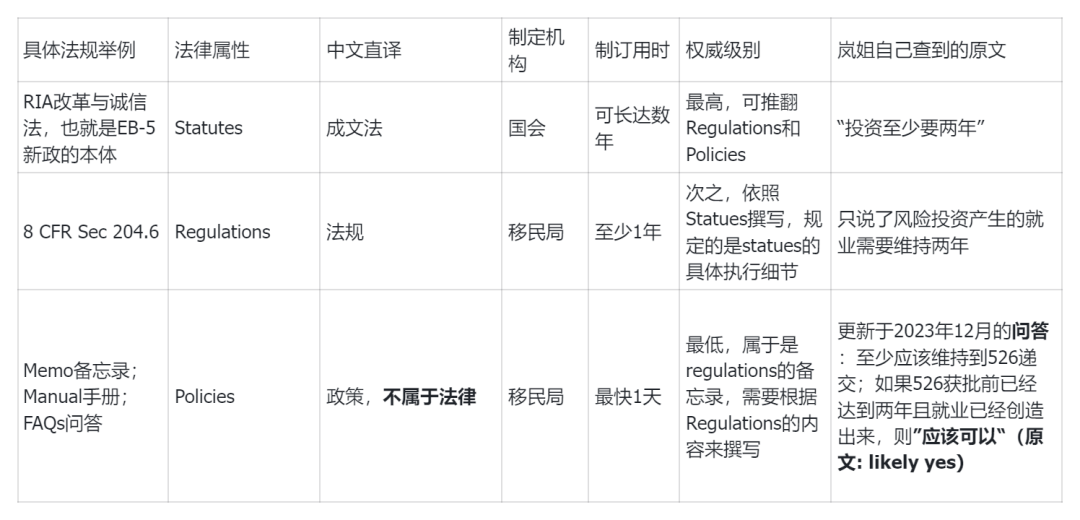 如上表所示,政策类别的问答,Memo等,是受到法规的制约的。而真正能制约最新的Memo和问答的法规,移民局还没有写出来。
