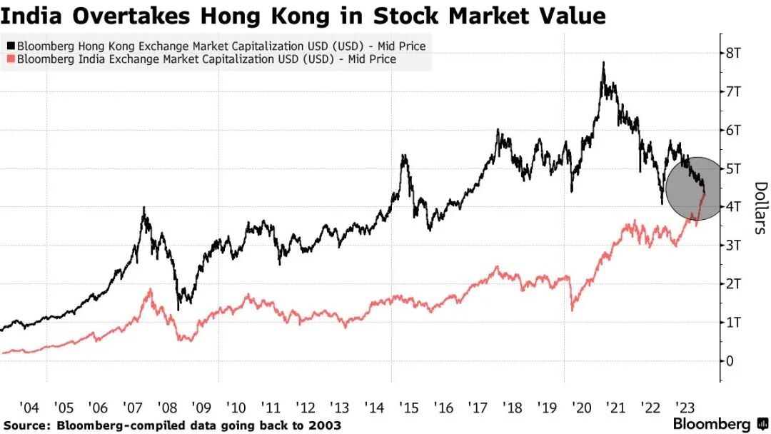 根据外媒报道,2024年1月22日,印度股票总市值达到了创记录的4.33万亿美元,以微弱的优势超过香港的4.29万亿美元,晋升全球第四大股票市场。