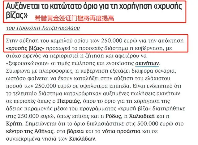根据希腊媒体报道,希腊政府正在考虑将更多地区的购房移民门槛从25万欧涨到50万欧。