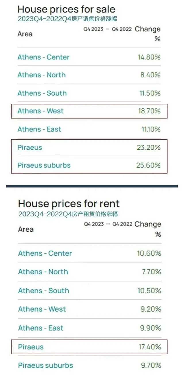 比如2023年Q4季度同比2022年Q4季度,雅典区域的房价和租金均有不同幅度的上涨,其中比港及雅典西部地区表现最为突出,涨幅分别达25.6%及18.7%。