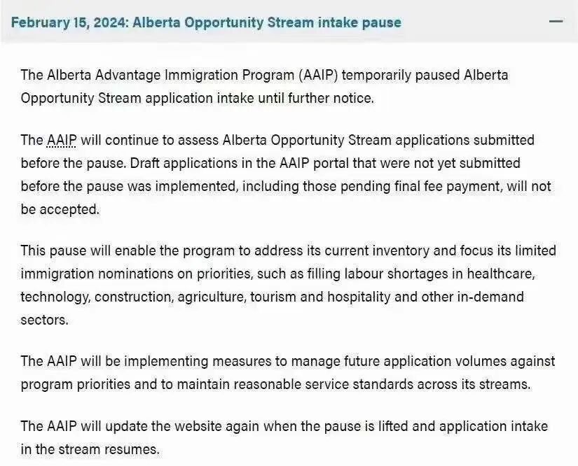 北美时间2月15日,阿尔伯塔政府无预兆发布通知:暂停接受省提名AOS申请,至于后续新政策何时推出,将另行通知。