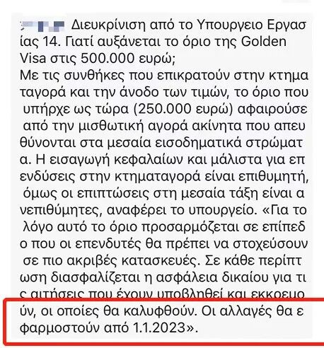 第一个是劳工部官方的消息,希腊劳工部16日回答了与解决年轻人住房有关的19个问题,其中在第14个问题中,提到了“黄金签证”的涨价问题,明确指出了“黄金签证”新政策将从2023年1月1日开始实施。相当于直接给变政圈定了一个截止日!