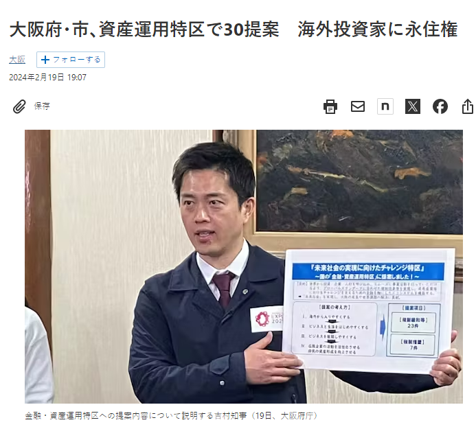 根据日本媒体的报道,2月19日,日本大阪政府对外界公布了“金融和资产管理特别区”的提案。