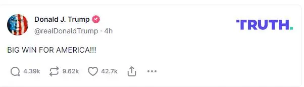 这一结果宣布后,川普立即在自家旗下的社交媒体上发文:美国大胜!