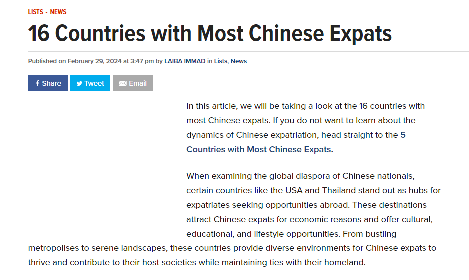 近期,美国著名投资信息网Insider Monkey做了一项有趣的调查,内容是调查全球范围内,中国移民人口分布最多的16个国家。