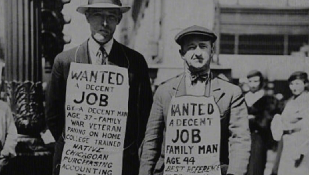 企业大量倒闭,失业率从3%疯涨至25%,以至于不少的美国人不得不到街上,举个牌子四处求职。