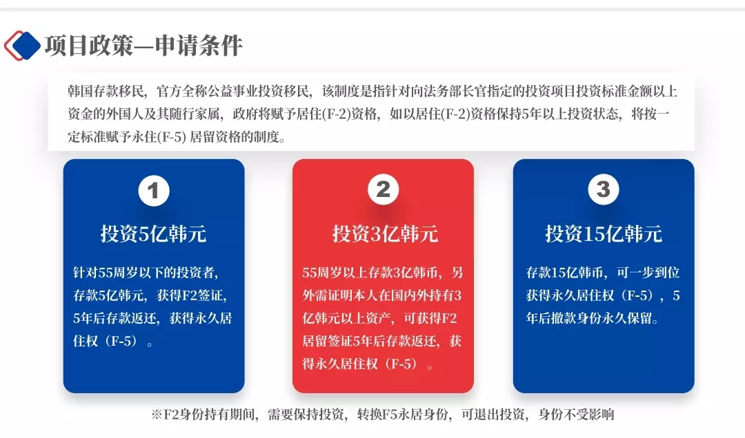 第二档针对55岁以上的退休人员,投资额降低至3亿韩币,也就是160万人民币,也是先拿F2临时居留身份,存款满5年后申请转永居。