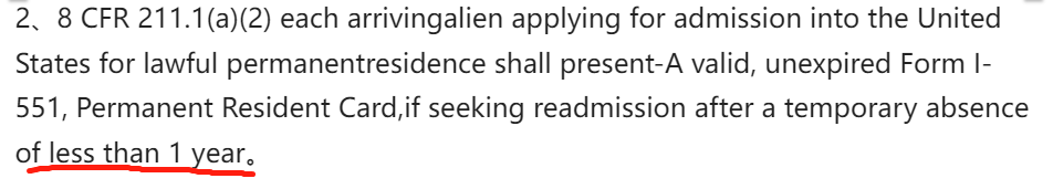 第五点、也是最重要的一点,如果有离境1年以上的需求,为了不影响绿卡身份,需要在离境前申请Re-entry Permit,俗称回美证。回美证有效期两年,相当于是给美国政府的请假条。如果没有回美证就离开美国一年以上,可能会被视为放弃美国永久居留身份。最近这几年疫情,大家没法正常的往返美国,就有很多朋友是申请的回美证在国内生活。