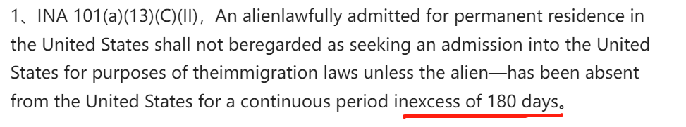 第二个是如果绿卡持有人离开美国的时间超过1年以上,就可以认为其自动放弃绿卡身份。
