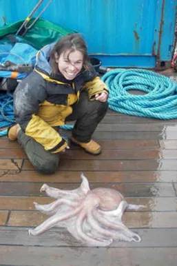 10年之前,本公众号提到过的La Trobe University的遗传学家Jan Strugnell 博士在海上进行研究时的照片(2012)由此可见章鱼与人的比例关系