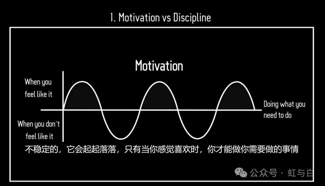 动力是不稳定的,时而高涨,时而低落,只有当你有心情时,你才能做你需要做的事情。自律则更为稳定,因为即使你没有心情,你也能做你需要做的事情。