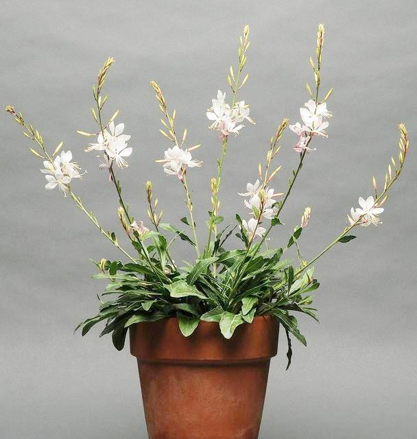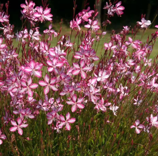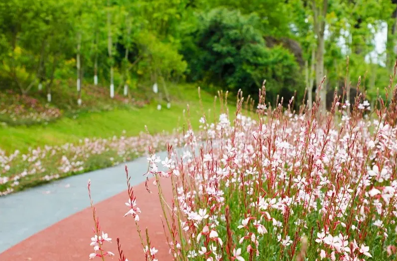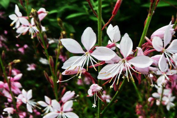 千鸟花也叫白蝶花、玉蝶花等,学名山桃草,是多年生宿根草本花卉。千鸟花是花叶分离的,花穗高耸,开花量大,随风摇曳,非常飘逸灵动,是常用的花境搭配植物,千鸟花生命力旺盛,也常用作地被植物群植或片植。