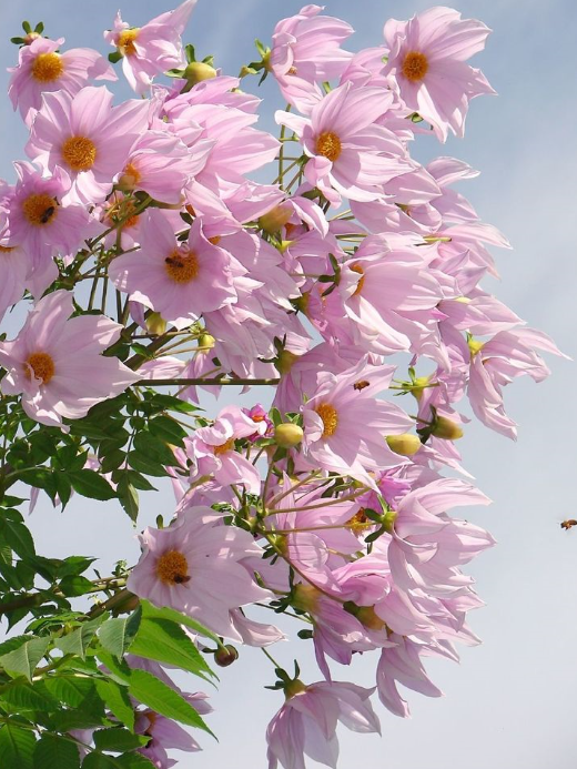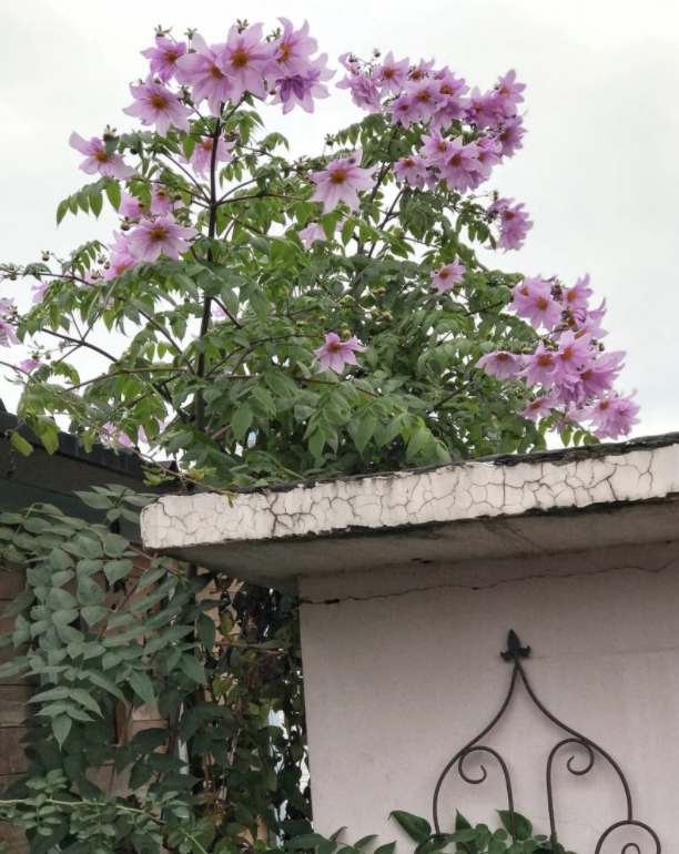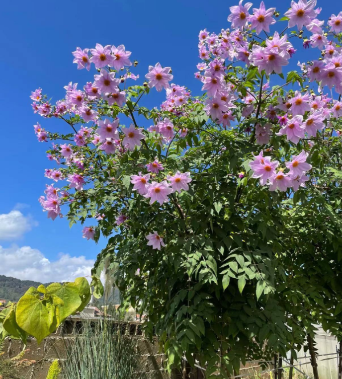 帝王大丽花也叫树大丽花,顾名思义可以长成树一样的大丽花。帝王大丽花是大丽花属的植物,从墨西哥到中美洲地区,总共有27种野生分布,其中茎杆木质化的3种被称为树大丽花,而帝王大丽花则是其中茎杆最为粗壮的,也是植株特别高的一种,可以长到2-5米高。