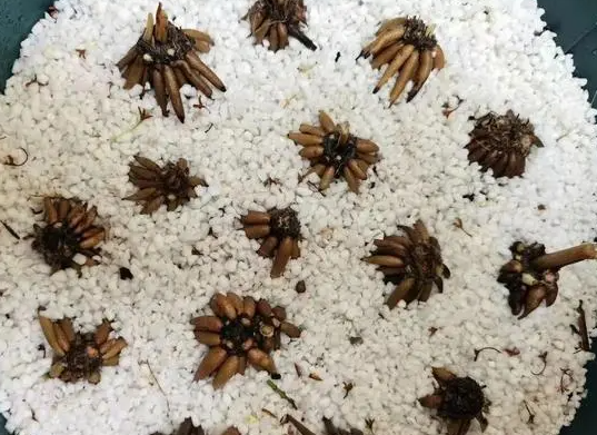 用一次性饭盒,在底上铺一层处理好的珍珍岩,然后将泡好的花毛茛爪子放在上面,注意不要放反了,秃的一头朝上,有尖角的朝下。然后再覆盖一层珍珠岩,覆盖2/3的爪子就可以了,之后放在冰箱的保鲜层进行催芽。