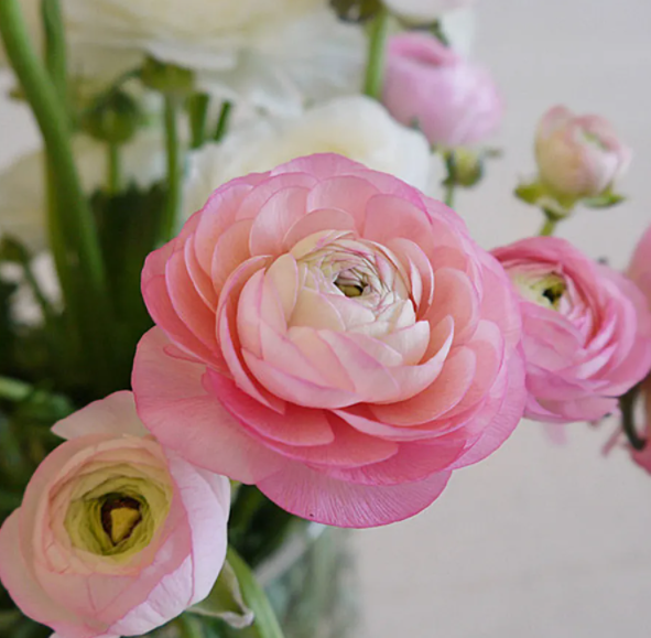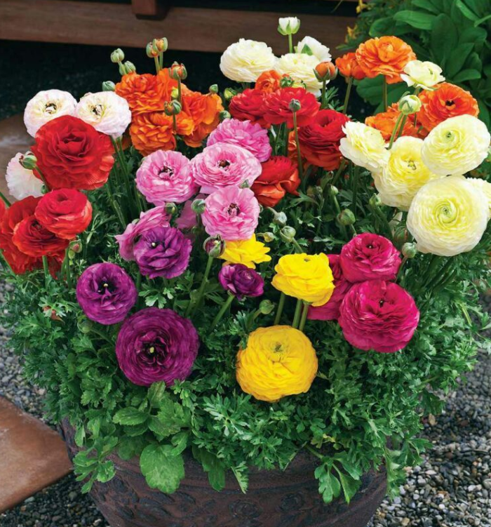 花毛茛为毛茛科、花毛茛属多年生草本植物,因叶子酷似芹菜也被称为芹菜花,原产于欧洲东南部和亚洲西南部。花毛茛的花色非常丰富,花型似牡丹,多为重瓣或半重瓣。花毛茛的自然花期在春天4-5月份,株型小巧,非常适合盆栽观赏,也可以做切花,是常见的观赏盆栽和鲜切花素材。