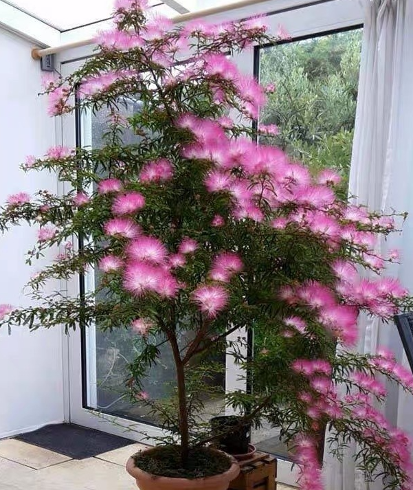 合欢花寓意阖家欢乐,和和美美,合欢花也有很高的药用价值,具有解郁安神的作用,失眠健忘的人可以经常泡合欢花茶来喝。普通的合欢花树长的非常高大,只能地栽,而香水合欢花就比比较适合盆栽了,它不仅株型小巧,而且开花多,花期长,花色也比普通的合欢花更加鲜艳好看。