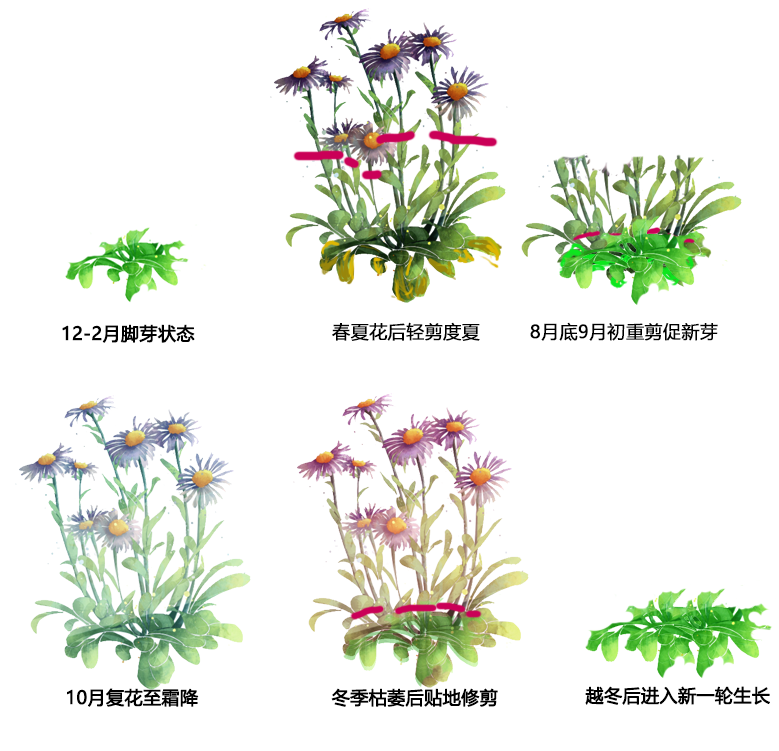 紫苑在生长期的时候,不需要过多修剪,只需及时将枯叶修剪清理掉。在春夏开完花后,及时把残花剪掉,保留老的枝条让它度夏,入秋时再将老枝剪掉,加强肥水,紫菀就会从基部发出新芽,到秋季10月前后就能再次开花,一直持续到霜冻。北方地区,在夏季花后就可以直接重剪,然后加强肥水,让紫菀再次复花。