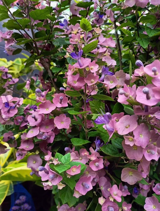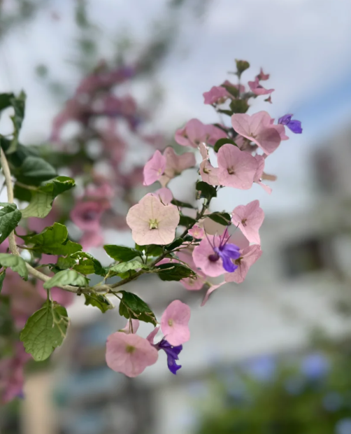 粉苞冬红是多年生常绿灌木,原产于印度、尼泊尔等地,植株可以长到3-7米高,生长迅速,花期长,花朵是花中花,粉色的苞片中间还有一朵紫色的小花,酷似蝴蝶,整个花朵像个小帽子,也被叫做粉帽子花,具有很高的观赏价值,在我国华南地区多有栽培,做庭院绿化或盆栽观赏。