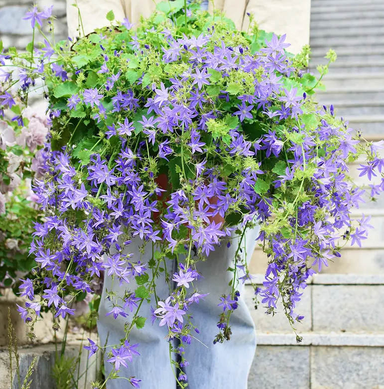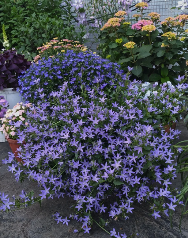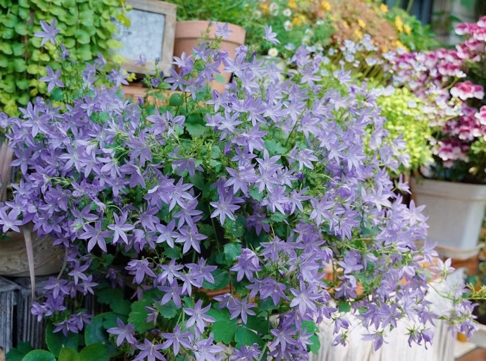 垂吊风铃草可以地栽匍匐生长,也可以盆栽,摆放在哪都好看,地栽时不挑土壤,建议种植与背风向阳处,盆栽时建议重点关注一下这几点,垂吊风铃草就能越长越多,年年开爆盆了。