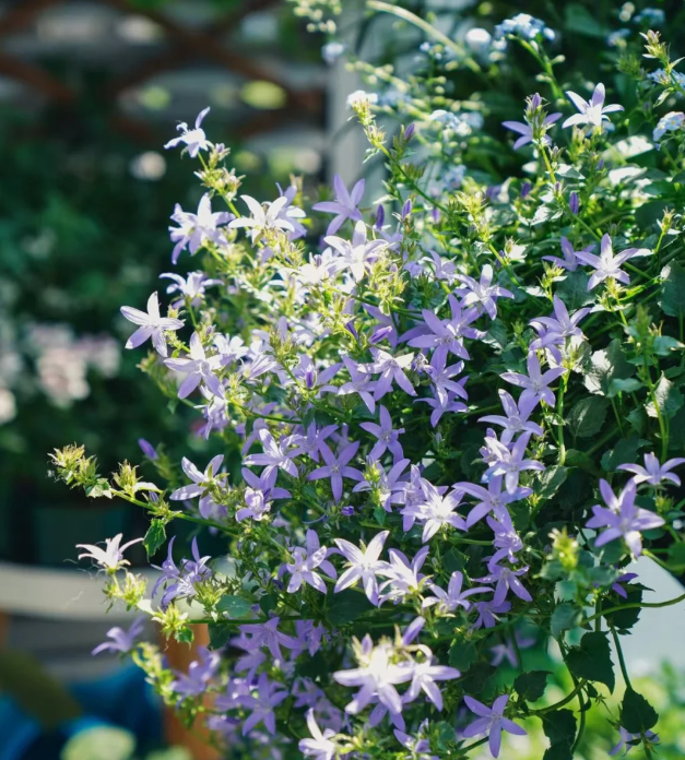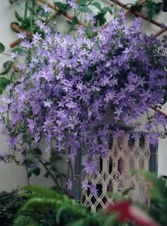 垂吊风铃草开花时,蓝紫色的小花,如瀑布般倾斜而下,无论是在阳台,还是庭院里,它都是妥妥的颜值担当,更重要的是,垂吊风铃草不仅颜值高,还非常皮实好养,耐寒也耐热,对光照要求也不高,种一盆越长越多,年年开爆。