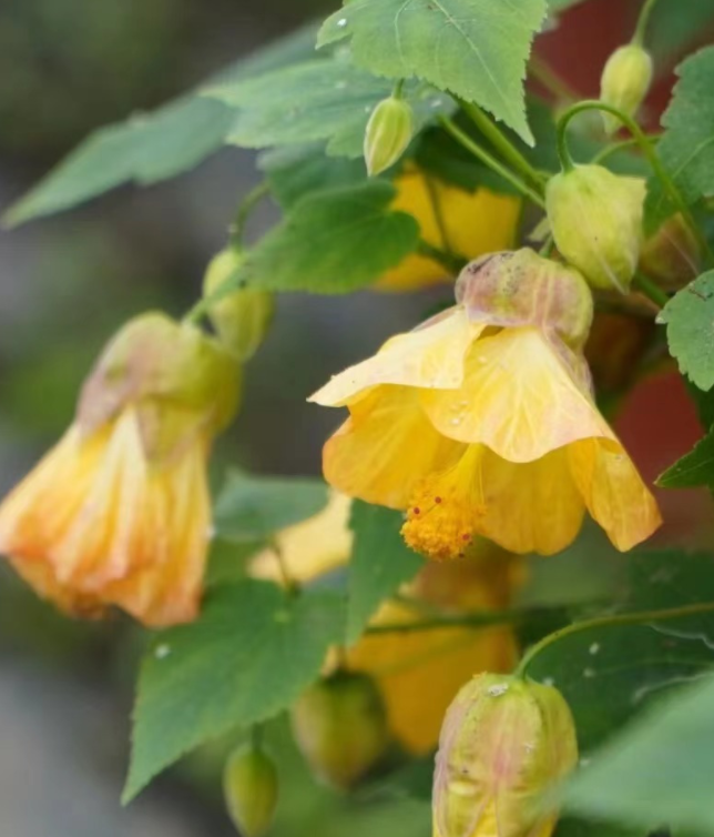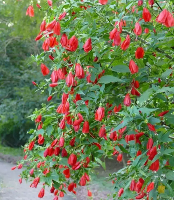 悬铃花是锦葵科悬铃花属常绿小灌木,植株高度在30-60cm,外形与朱槿花很相似。悬铃花的花形似风铃比较奇特,花朵半开悬挂于枝头,开花时像一个个小风铃挂在枝头,黄色的可爱,红色的喜庆,花量大,在温暖地区可全年持续开花不断。