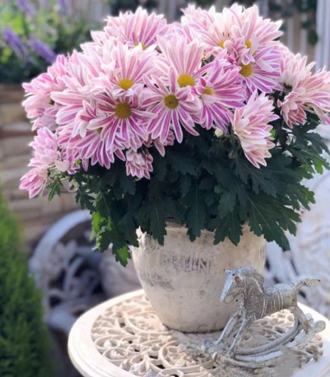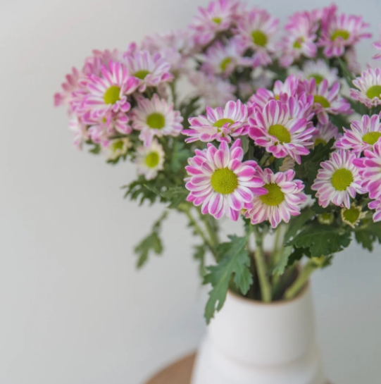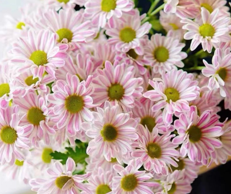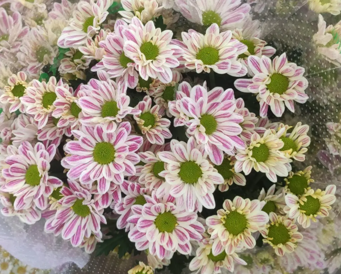 斑纹菊属于菊科,是正儿八经的菊花,花期通常在秋季和春天,斑纹菊的花朵不大,和纯色的千头菊差不多,其实您也可以理解为,斑纹菊就是千头菊的一个品类,不过斑纹菊的长势强劲,适应性强,枝条生长的比千头菊更长些,所以很适合做切花培育。当然如果我们做一些控高措施的话,也可以养成低矮的盆栽。