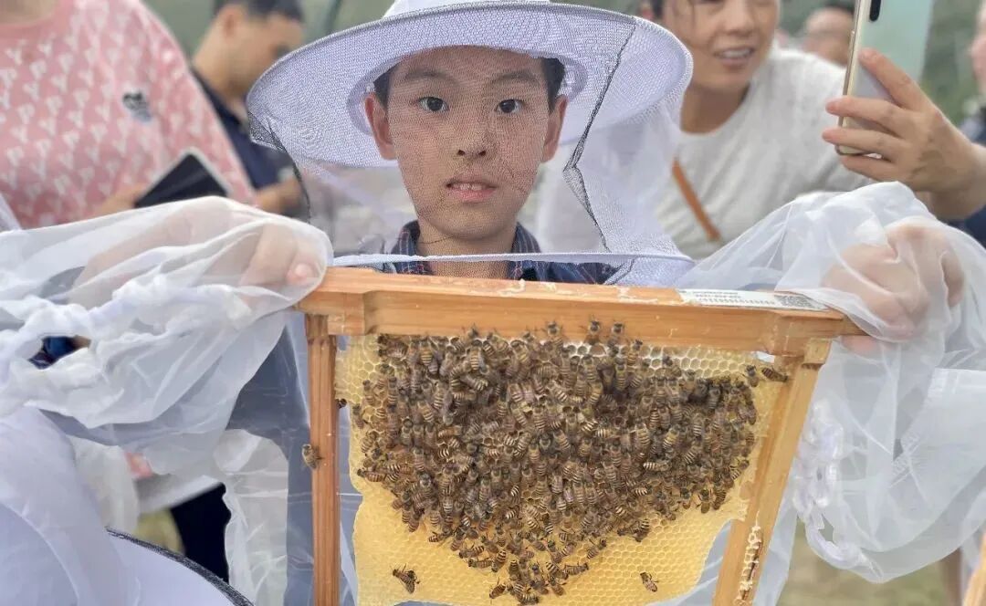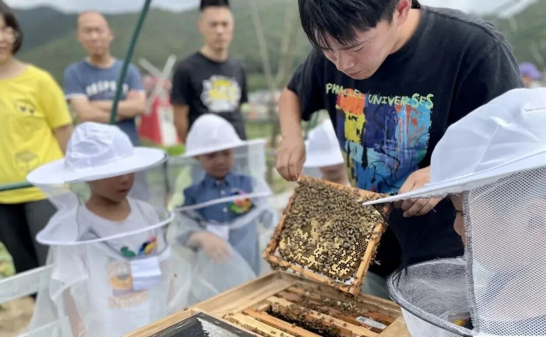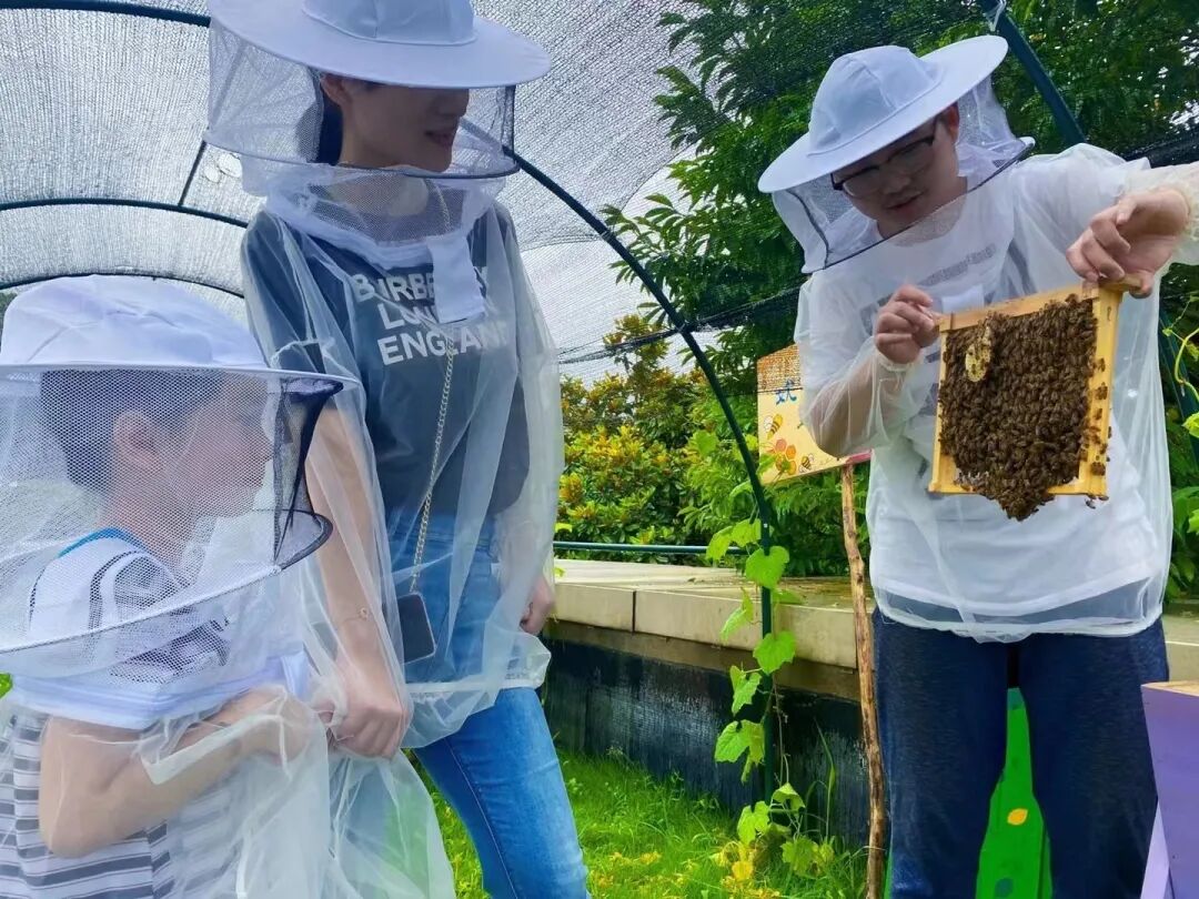 一花一世界,一叶一天堂,九龙湖环境优美、绿意盎然,课堂上老师不仅会揭秘了小蜜蜂王国的构成、不同的成长阶段,还让小营员们穿上防蜂服深入蜂园,去到每一个可爱的蜂房寻找蜂王、雄峰和工蜂。