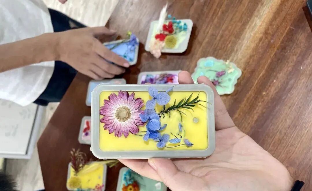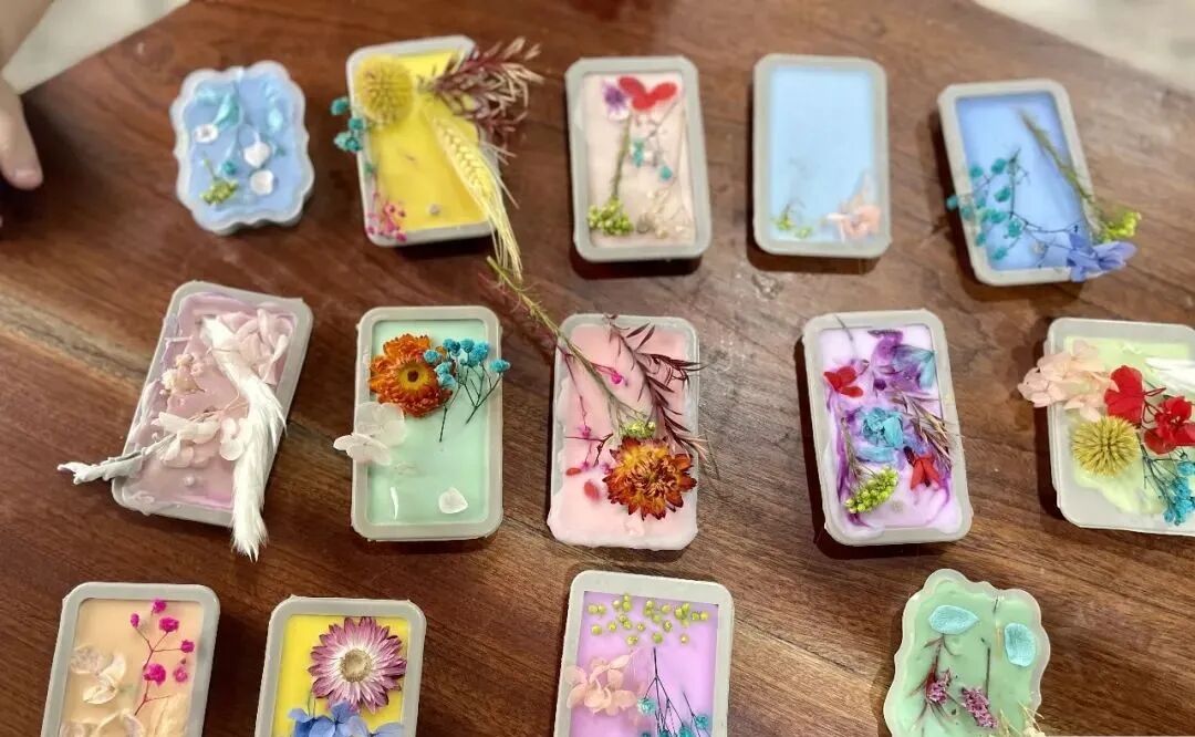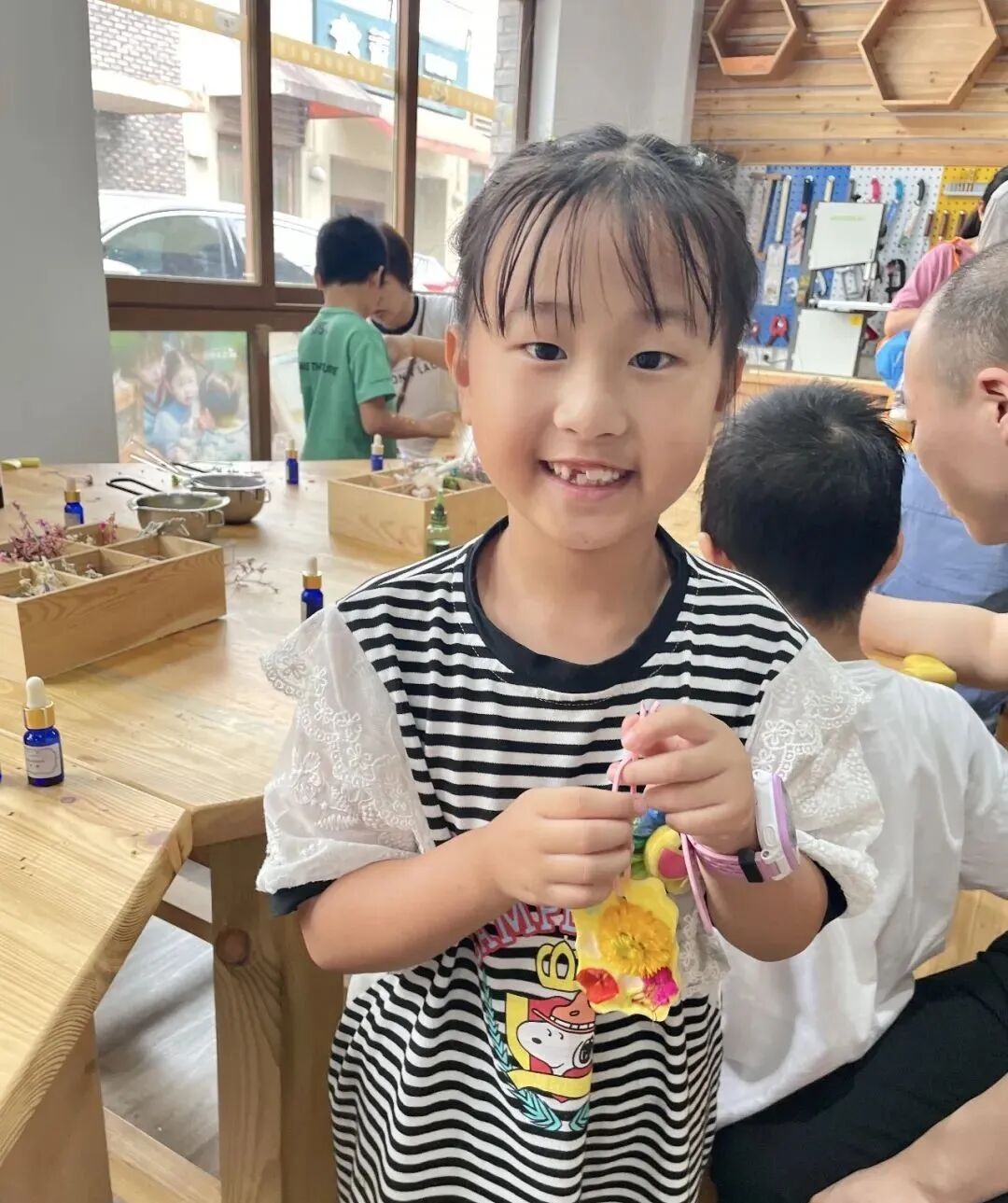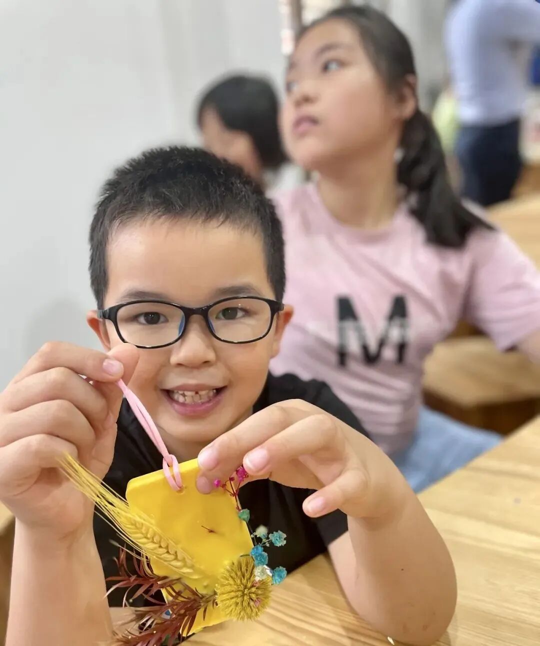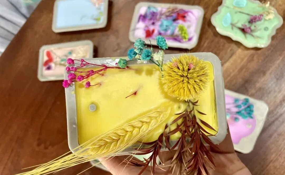 蜂蜡牌制作隆重登场,小营员们兴高采烈的设计着自己的模具里的空间,提前准备好的花朵、麦粒、树叶等等染上了缤纷的色彩,大家或留白、或错落有致、或上下搭配等一系列天马行空的想象落在了蜂蜡牌的模具里了,调上自己喜欢的精油和颜色,把融化的蜂蜡倒进自己的作品里,静待成型。大家不仅仅收获了自己的蜂蜡牌,还有友谊和欢笑。
