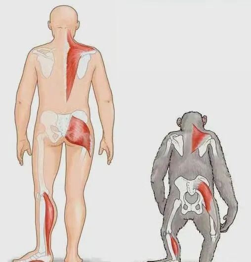 用脊柱摇摆的方式推进身体向前,这在鱼类和蛇类身上可以看到,它们没有演化出高等生物特有的髋关节,所以只能用这种原始的方式赋能,大猩猩虽然进化出髋部,但其宽大的骨盆在分娩与直立方面选择了前者,因此在行走中仍然需要借助侧链的摆动来辅助,这也是为什么猩猩在直立行进时也会有躯干摆动的原因,综上,就人体而言,筋膜侧链更像是前表线与后表线的补充,功能有限但不能没有。