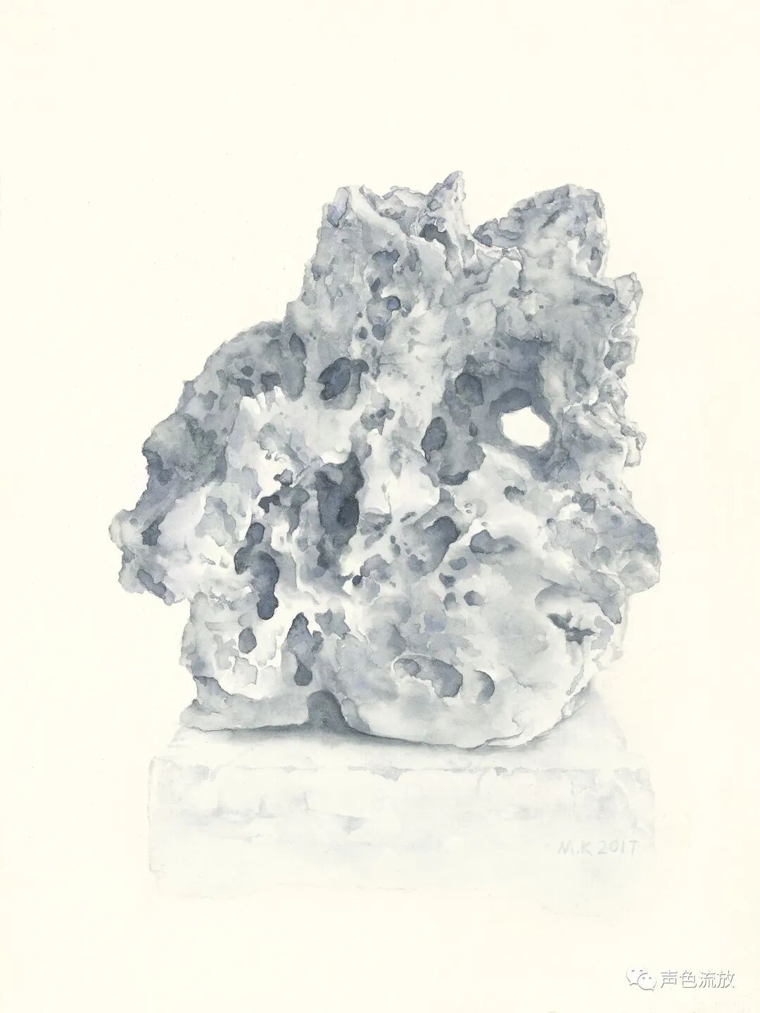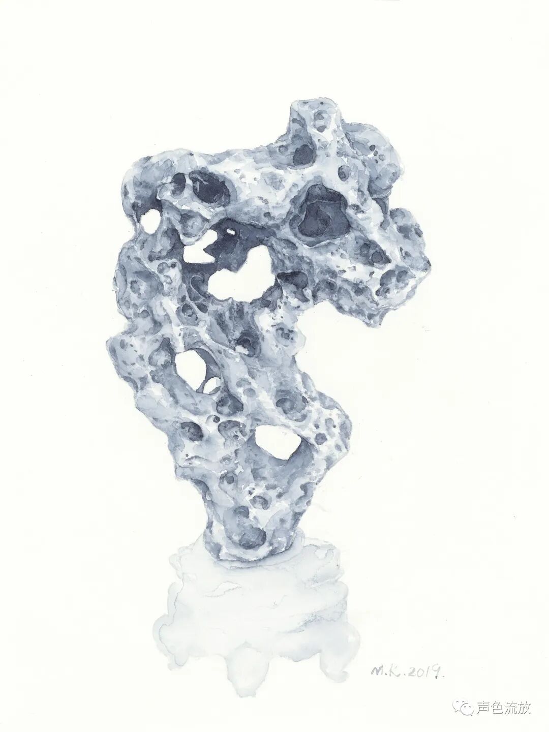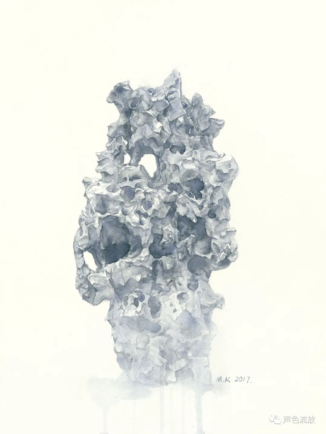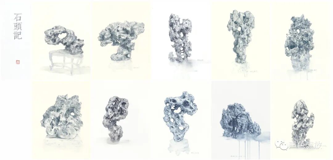 又过了两三年,我又在手机上看见了明可的新作品《石头记》,这是一系列纸本水彩画,观念上似乎是之前那个图片作品《风蚀》的延续,几乎全是单色,非常细致精彩,感觉上与通常的水彩画完全不同,造型以线条的穿插为主,密不透风,疏可跑马,画法也更加近似中国工笔画,有一些明暗关系和体积的塑造,但更多的是疏密关系和平面的延展。就像我常说的那样:我喝酒不是喝酒,是喝兄弟,酒量不行,仍然往死里喝。这些是太湖石还是假山石,一点都不重要,醉翁之意不在酒,我在这些石头里看见了人,那些古怪的造型,与其说是石头,不如说更像是一个个千疮百孔的人。或昂首挺胸,或搔首弄姿,或无奈躺平,或举杯望月,或老态龙钟,无论他们年龄大小男女有别,他们都毫无例外的满身弹孔、弹孔,全是弹孔,全是凶猛现实和无情岁月赐给他们的无法修复的弹孔。我写的很悲痛,但是明可这些画其实画得很放松,画面淡淡的,轻轻的,这似乎在体现着明可的某种心理状态:子弹们,你们继续打,老子不怕,有种就继续,老子无所谓。这是一种超然和洒脱。