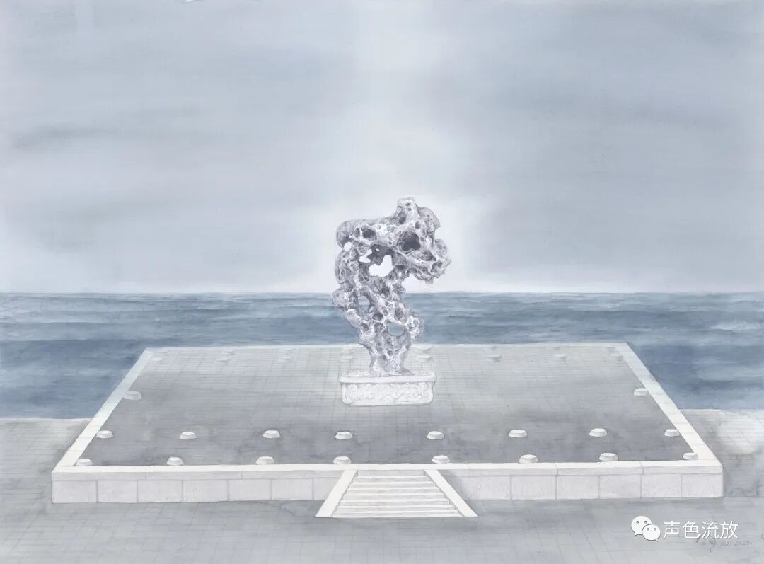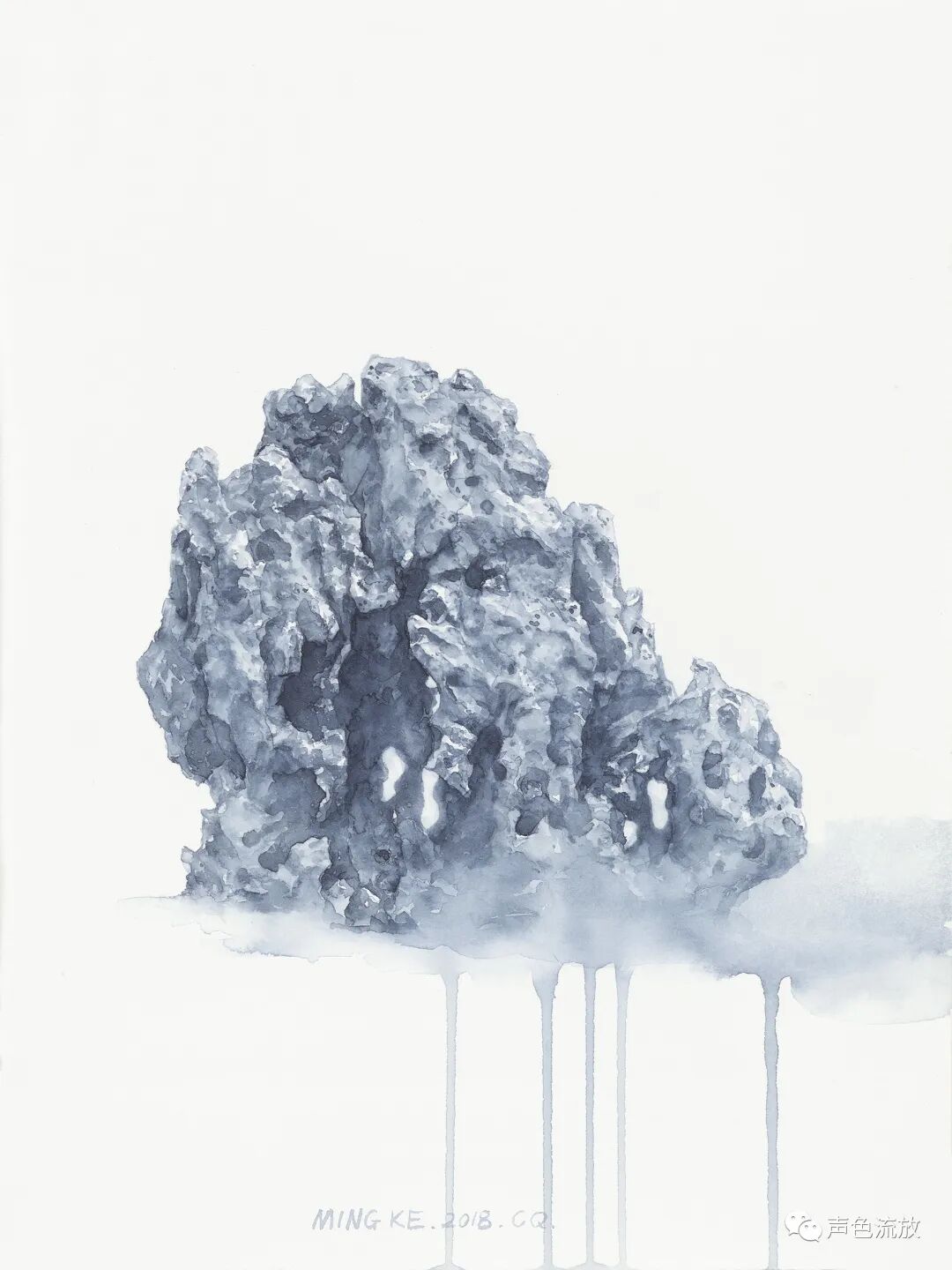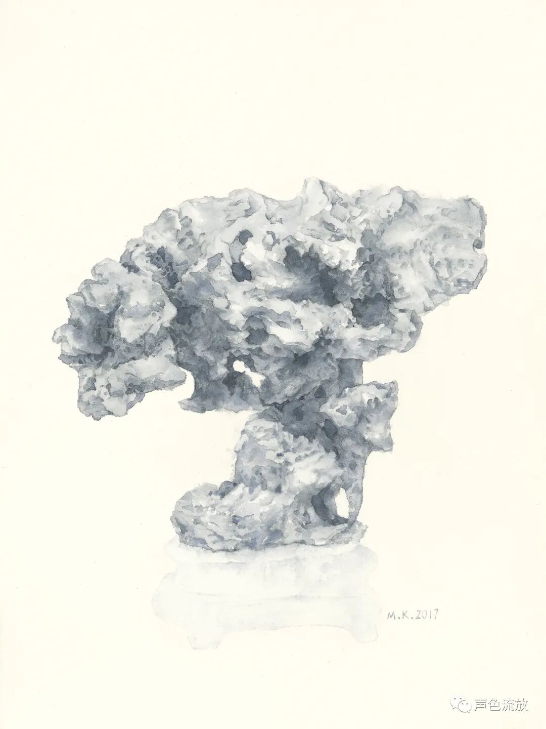 又过了两三年,我又在手机上看见了明可的新作品《石头记》,这是一系列纸本水彩画,观念上似乎是之前那个图片作品《风蚀》的延续,几乎全是单色,非常细致精彩,感觉上与通常的水彩画完全不同,造型以线条的穿插为主,密不透风,疏可跑马,画法也更加近似中国工笔画,有一些明暗关系和体积的塑造,但更多的是疏密关系和平面的延展。就像我常说的那样:我喝酒不是喝酒,是喝兄弟,酒量不行,仍然往死里喝。这些是太湖石还是假山石,一点都不重要,醉翁之意不在酒,我在这些石头里看见了人,那些古怪的造型,与其说是石头,不如说更像是一个个千疮百孔的人。或昂首挺胸,或搔首弄姿,或无奈躺平,或举杯望月,或老态龙钟,无论他们年龄大小男女有别,他们都毫无例外的满身弹孔、弹孔,全是弹孔,全是凶猛现实和无情岁月赐给他们的无法修复的弹孔。我写的很悲痛,但是明可这些画其实画得很放松,画面淡淡的,轻轻的,这似乎在体现着明可的某种心理状态:子弹们,你们继续打,老子不怕,有种就继续,老子无所谓。这是一种超然和洒脱。