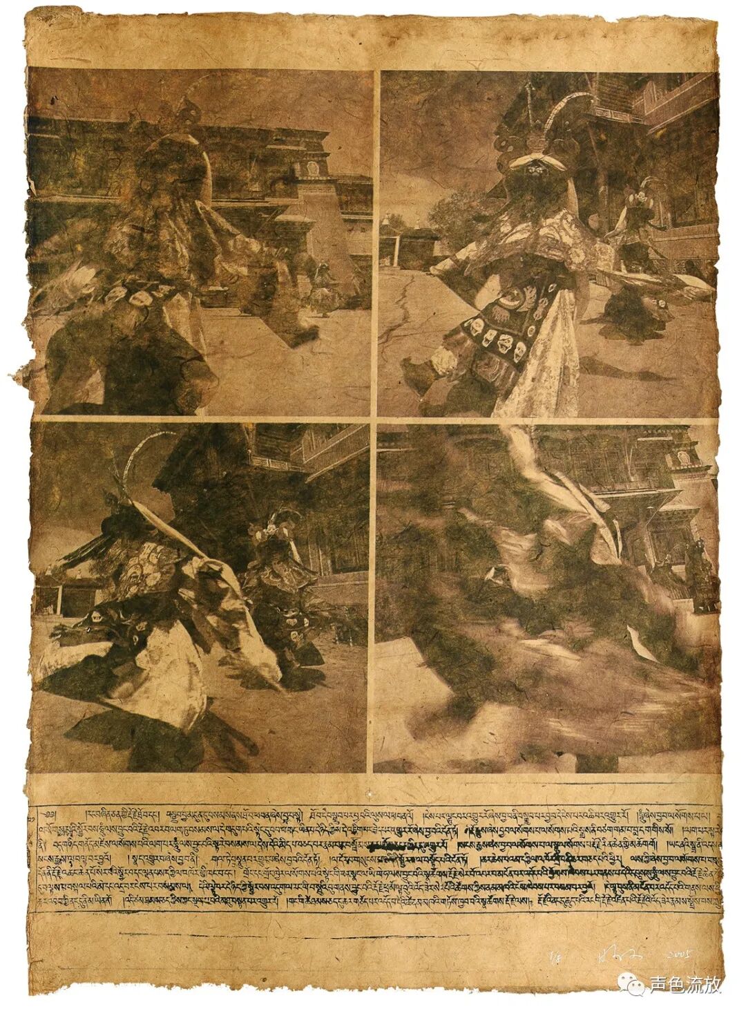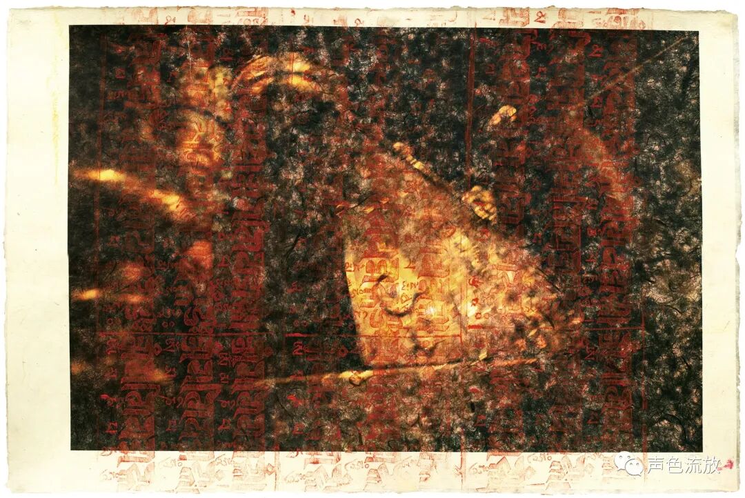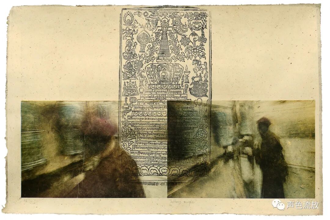 明可有没有和哪个美丽的藏族女孩唱《草原之夜》或者《康定情歌》,他没告诉我,但是他拍了非常多的相片,这我知道。虽然藏区人美风光美,但千万不要以为明可拍的是那种器材高级光影漂亮色彩悦目的网红照,他是带着想法去拍的,能够用水墨在宣纸上画出清晰裂缝还可以欺骗误导专业老师的人,显然不会再去在相机上纠结清晰度和标准的曝光指数。后来,明可将这些相片的一部分想办法印在了一种特殊的藏纸上,形成了一种类似于版画的作品,叫做《印》系列,效果非常棒。关于这个系列,明可这样说道:西藏对于我来说,熟悉的是那里的山山水水和历史人文,而陌生的是永远也看不透的心中的那个“西藏”。我拍摄了很多模糊的影像,并将图像转印到藏纸上,借助藏纸的质感和粗糙来表达我的一些感受。后来,我带着这些印好的图像去了德格印经院,把珍贵古老的木雕版经文叠印到了我的那些模糊图像上面。给这组限量的影像作品取名《印》的最初想法,是因为我采用了工业化的印刷术再叠加木雕版原始手工印刷,而两种完全不同的印刷方法同时使用,其实正和西藏目前古老而又现代的现状吻合。而“印”这个字本身,也是我的这组图像本身的意义。因为西藏给我的可能更多的只是“印象”,她的一切,可能永远对于我这个过客——都是那么的模糊、不清楚。