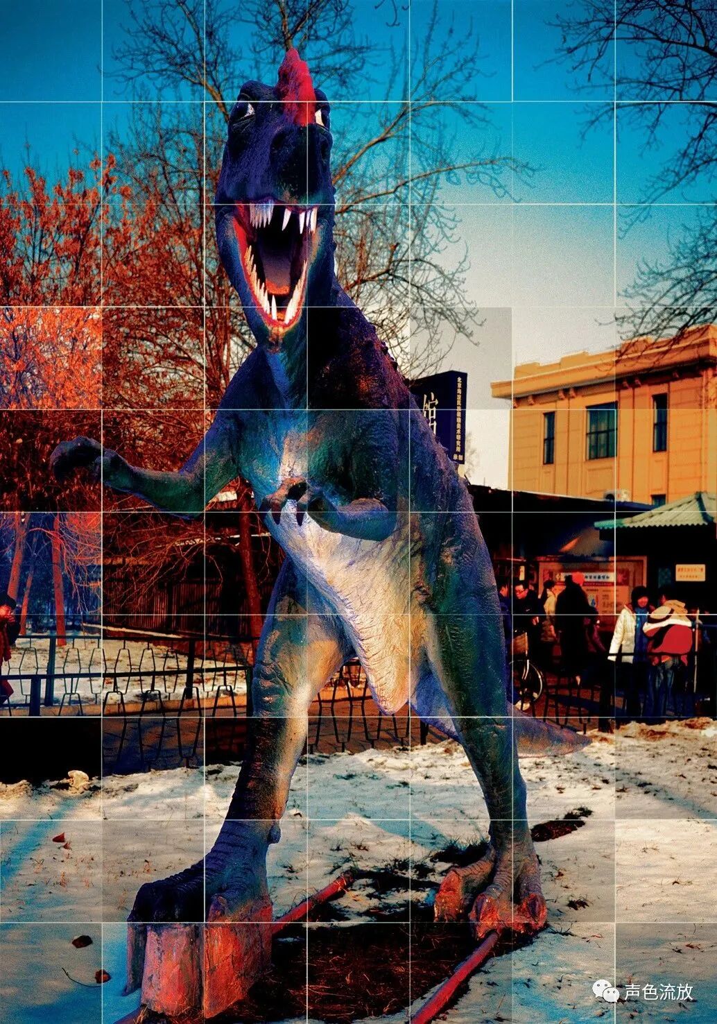 大概几十年前,瓷砖做为高档货走上了历史舞台,让我们告别了脏兮兮的厕所和遍布油污的厨房,现在的瓷砖更加高级,质感光洁度大有可以干掉大理石花岗石的劲头,但是,瓷砖毕竟是瓷砖,就像玻璃就是玻璃,做得再好再逼真,也取代不了翡翠。明可的图片就印在瓷砖上,小块小块的瓷砖,拼接起来形成大片网格,变成精美的笼子,将那些假冒伪劣的动物们困在其中。这些动物雕塑尽管很蹩脚,但是大多有一种拟人化的感觉,仔细看,还是挺有意味。比如那对熊猫,或许是想表现相亲相爱一家人,但怎么看都像是王二婶和李大爷在偷情;那只恐龙,本来想吓唬别人的,但感觉它自己就一脸惊恐,胆小如鼠;再如那只带着宝宝的象妈妈,本来应该在丛林边悠闲散步的,但看起来更像是刚刚被城管没收了摊子的下岗女工,一脸委屈。