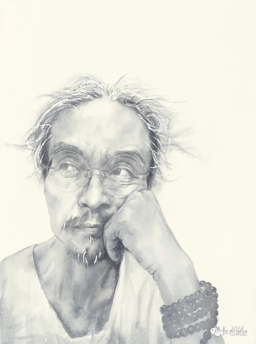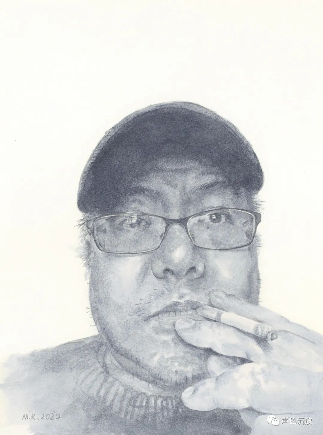 2018年,明可开始画一批纸本水彩肖像画,画的都是他熟悉的同学和友人,风格上和他的《石头记》一脉相承,也几乎都是单色的,除了《石头记》里那些线条造型方式以外,多了更丰富的细节,如果把这些画放大,每一个局部都是很纯粹而精美的抽象画,这可能和当初在学校临摹古代山水画有关,记得当时明可临摹的是台湾复制的超高清的《溪山行旅图》,那些细节上的笔墨功夫和节奏韵律,令人震惊。