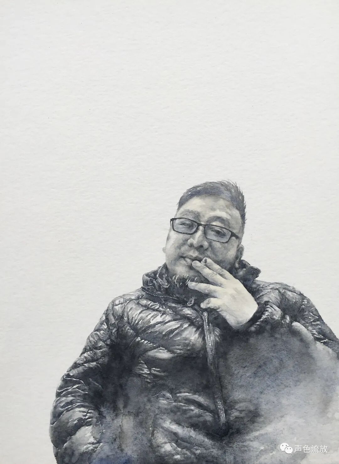 有一天,我面对着那堆“废品”,幻想着这些作品被哪个富豪包养了,又被哪个大牌策展人看上了,又被哪个超级画廊包装上市了,又被哪个博物馆馆长拿去给蒙娜丽莎当化妆品了,就像周星驰演的那个冒牌唐伯虎掉在了秋香的怀里那样,我阴险狡诈地哈哈大笑起来,笑得街坊邻居以为地震又来了。突然,一阵“啾啾”声把我惊醒,从黄粱一梦中把我揪了出来,备注,那是我微信的提示音。这是明可发来的消息,不是语音,不是文字,而是图片:第一声“啾啾”,一个大脑门,很亮,第二声“啾啾”,一副眼镜,有点硬度,第三声“啾啾”,一对耳朵,有点虚焦,第四声“啾啾”,一个大鼻子,传说中很有钱那种,第五声“啾啾”,一个有点下垮的嘴巴和小下巴,第六声“啾啾”,一个光头老帅哥在玩自恋搞自拍。没错,这就是明可画的放哥老人家我。那六声“啾啾”,是明可画我的进度和步骤。
