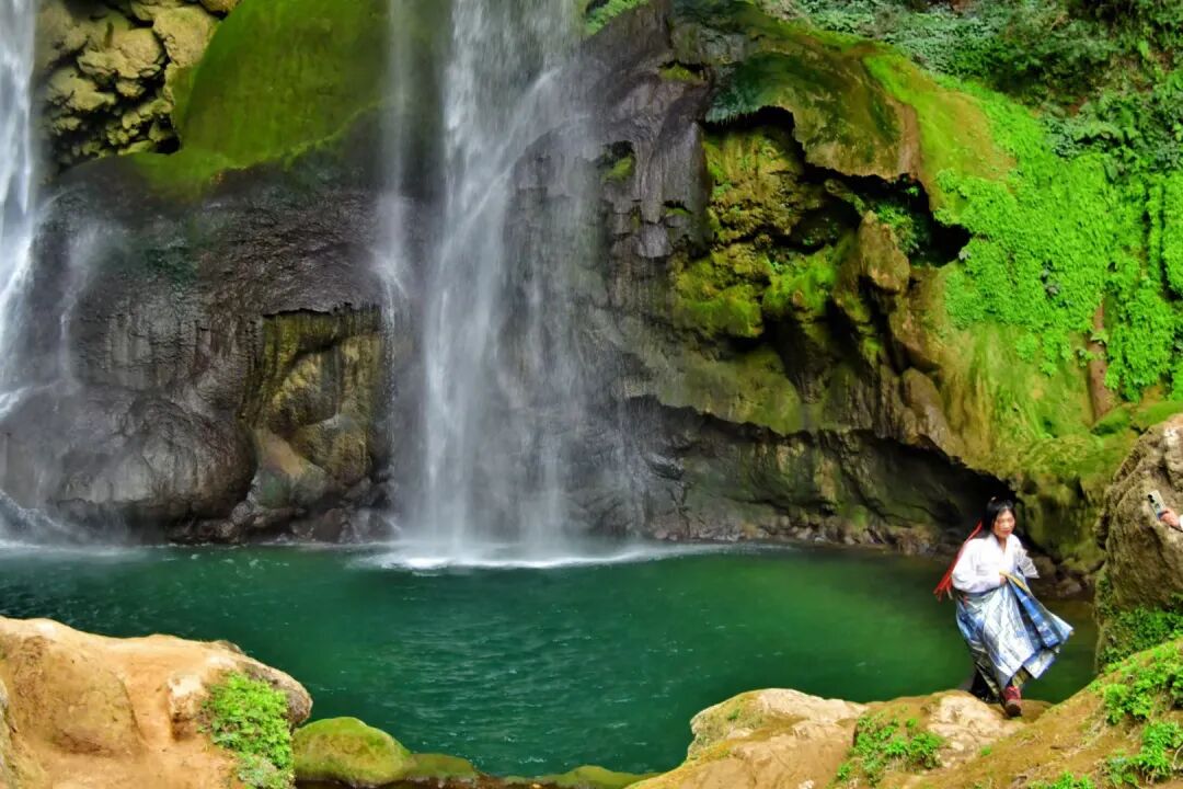 由于外形如羊皮的“羊皮洞”,洞高50余米,宽30余米,长500余米,洞中有多个侧洞,洞内厅堂高大。据传当年太平天国革命运动的起义军曾在此洞隐藏与抗清斗争长达十余年之久 。而羊皮洞下面壮观的瀑布,其飞流直下三千尺,吸引众多户外爱好者前来打卡留影……