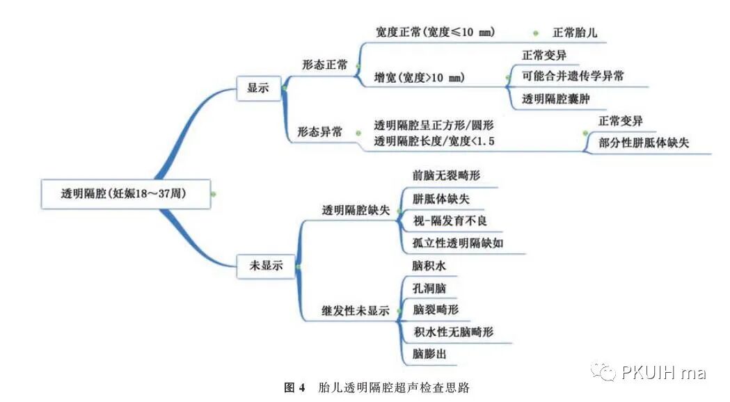 发现透明隔腔异常时我们可以从以下几个方面观察及考虑(见下图),必要时一定要做系统中枢神经系统筛查或者是结合MRI检查。