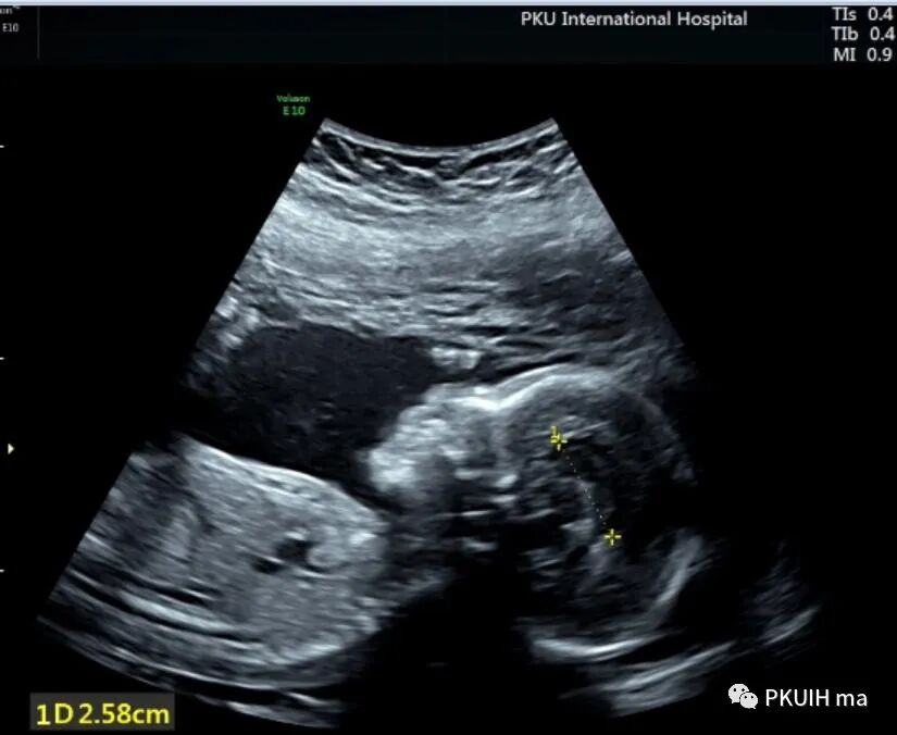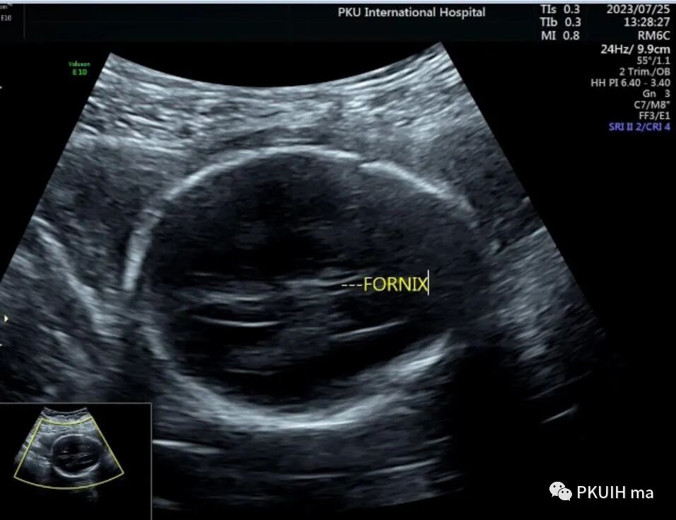 检查中不要把下方的穹窿柱和扩张上抬的三脑室以及融合的侧脑室前角误认为透明隔腔。正常情况下透明隔腔的内径约4-8mm,也有窄的或者宽的,只要形态正常即可,一般大于10mm可以报增宽,小于2mm考虑窄。此时需要关注透明隔腔的形态,一般透明隔腔呈长方形,个别的可以呈三角形,如果左右径大于前后径时认为形态异常。超声显示呈正方形或反长方形、圆形或者是前后径/左右径<1.5时要仔细观察胼胝体,以除外胼胝体发育异常。