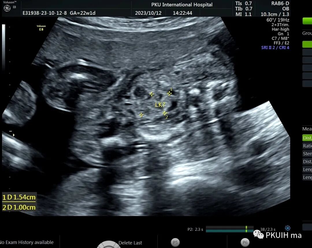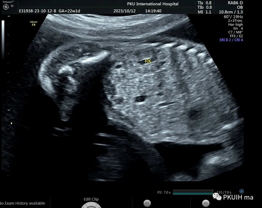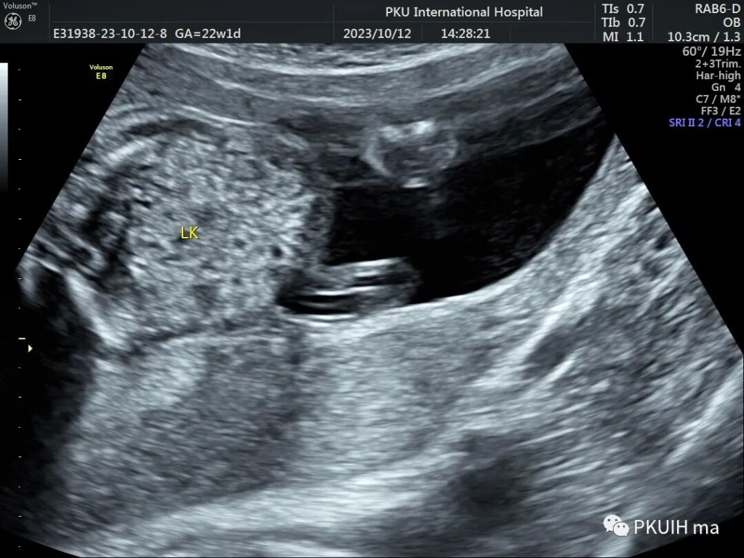今天看到一22周的胎儿,一侧肾区未见肾脏结构,肾上腺呈平卧征,肾动脉也未显示,在盆腔见到一个发育不良的肾脏回声。
