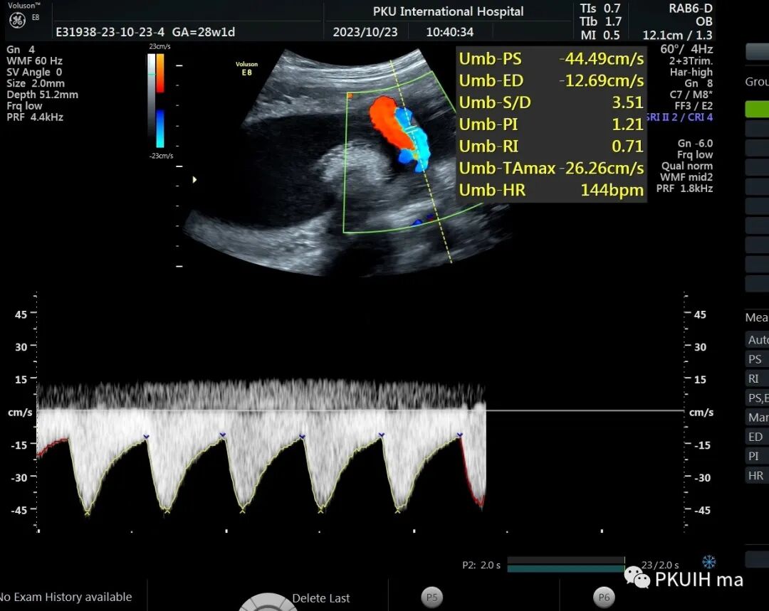 第二例是28周2天,脐动脉S/D值3.66,比第一例还高。同样脐动脉的阻力也在正常范围内(5-95%区间)