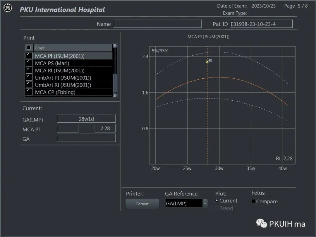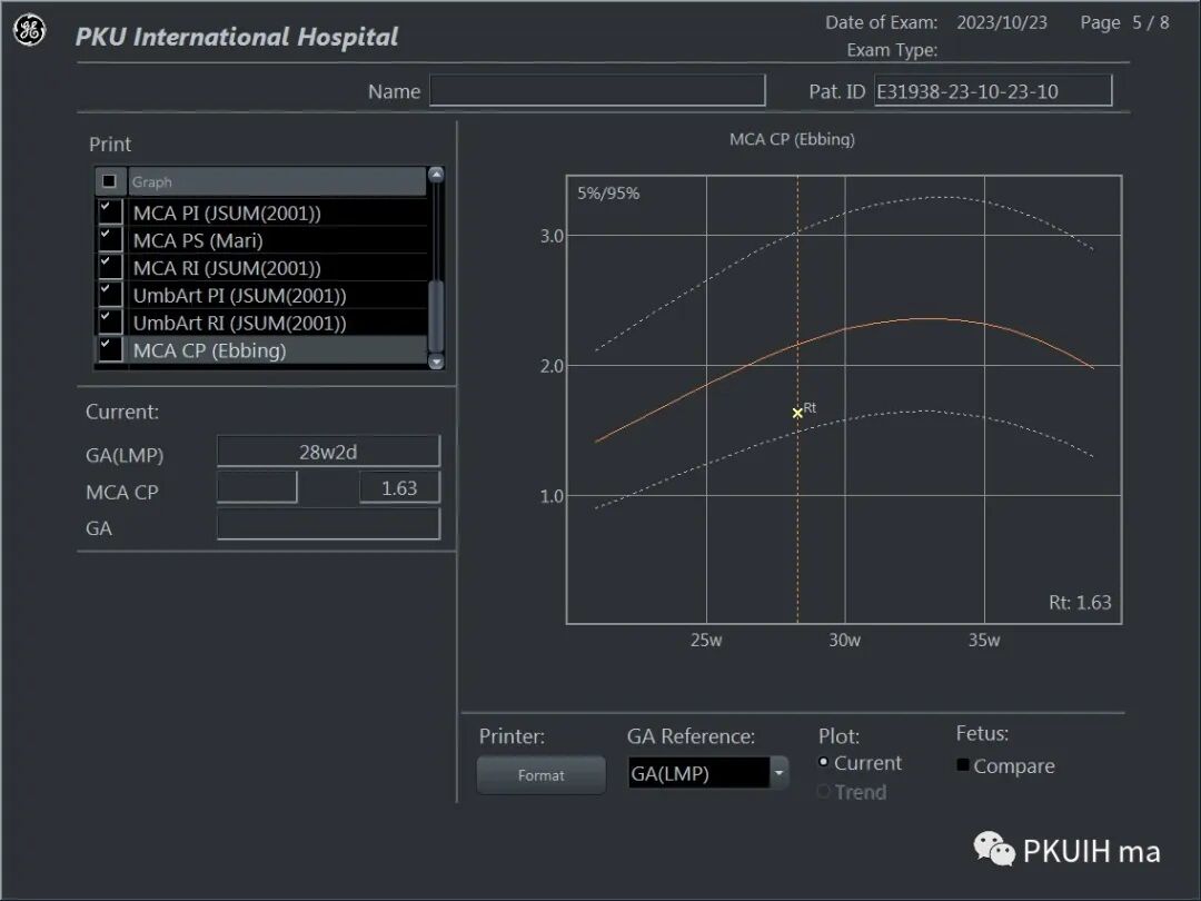 为了评估胎儿有无缺氧,以上两例均测量大脑中动脉并把大脑中动脉的数值也输入设备内,设备给出了大脑中动脉的参数标准,阻力在5-95%区间,同时显示脑胎盘比正常范围内。说明胎儿各血流参数均在正常范围(也可以测量静脉导管、主动脉等值存入),胎儿没有缺氧表现。