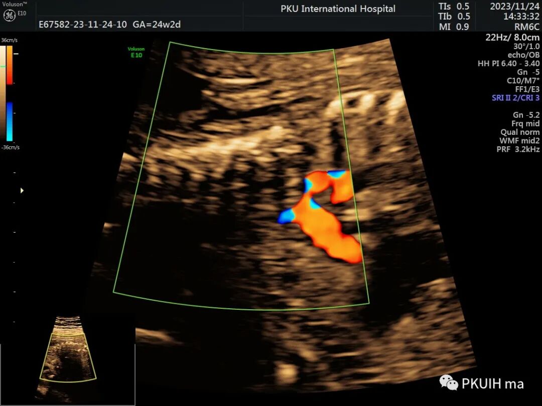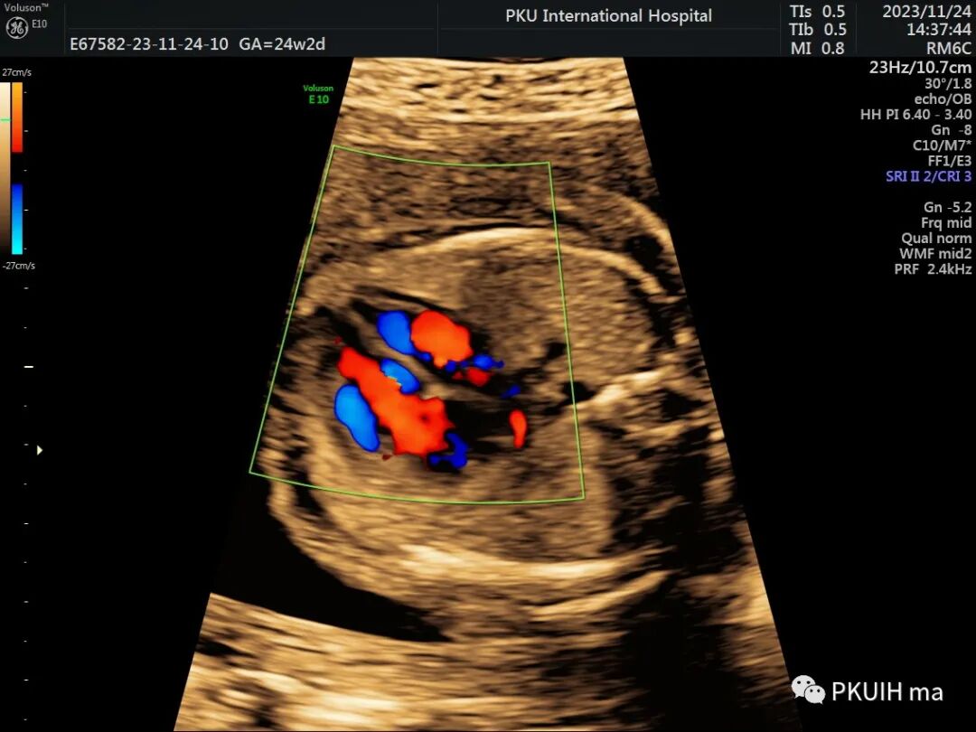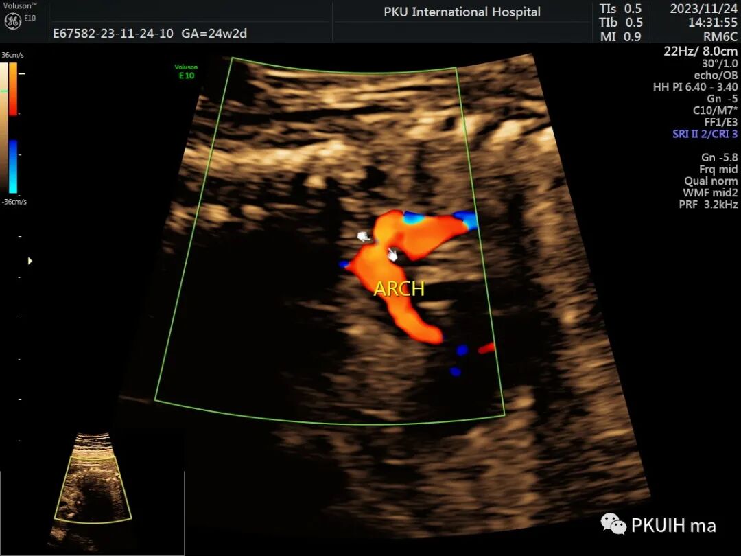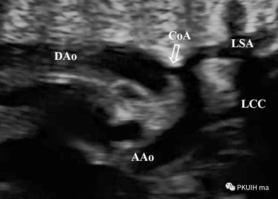 再次可以通过主动脉弓长轴、三血管气管切面观察,主动脉弓长轴切面显示主动脉横弓细窄。主动脉峡部内径与动脉导管内径比值减小与CoA高度相关,峡部与动脉导管内径比≤0.74时发生CoA风险明显增高。同时主动脉弓上的分支血管间距离增大,颈动脉与左锁骨下动脉之间的距离越远,缩窄的可能性就越大。