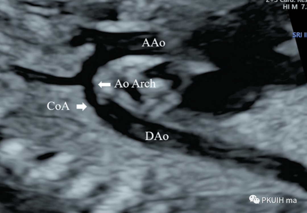 另外,主动脉弓长轴切面显示峡部与降主动脉连接处形态异常,主动脉弓缩窄处与粗大的降主动脉相连,局部形成环形缩窄或后壁向管腔内形成“嵴”样隆起,故称之为“缩窄环”,又称 “支架征” 。如下图