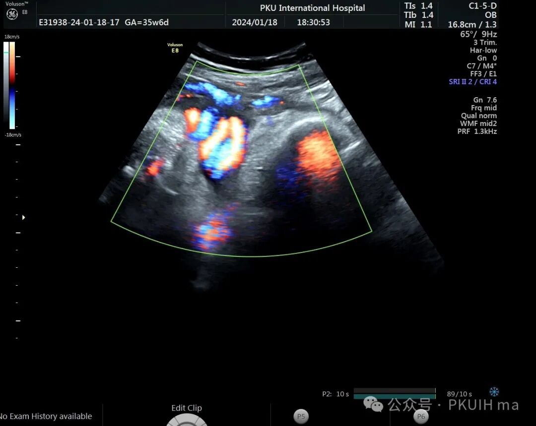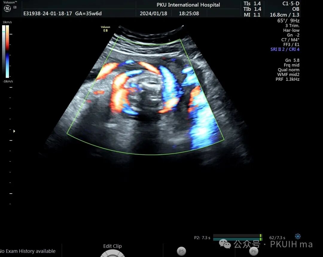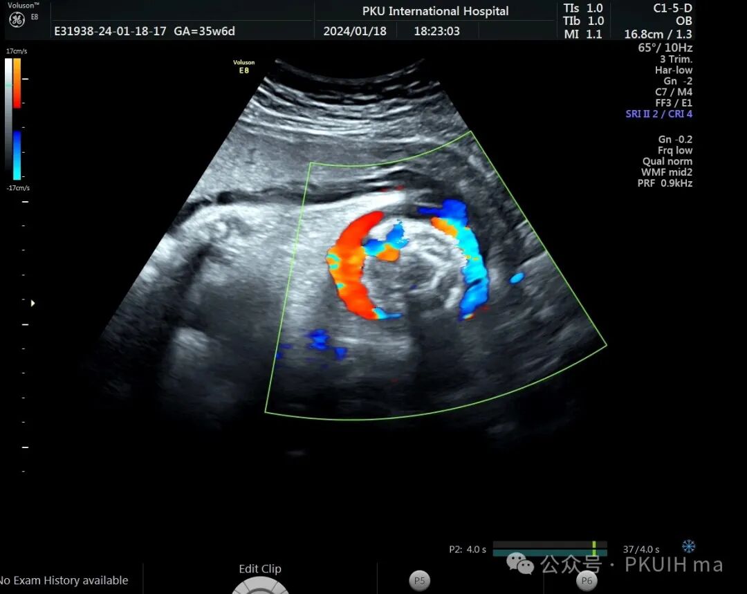 脐带绕颈两周以上,绕的特别紧,感觉脖子都被勒细了,脐带与皮肤之间无任何空隙。绕颈处血流加速时间延长,说明可能存在交锁并出现了脐动脉局部狭窄
