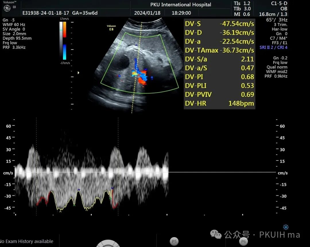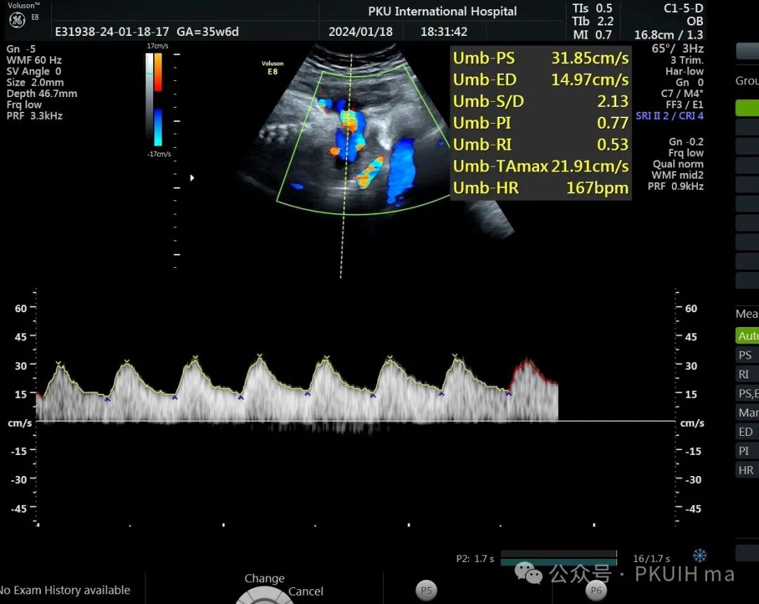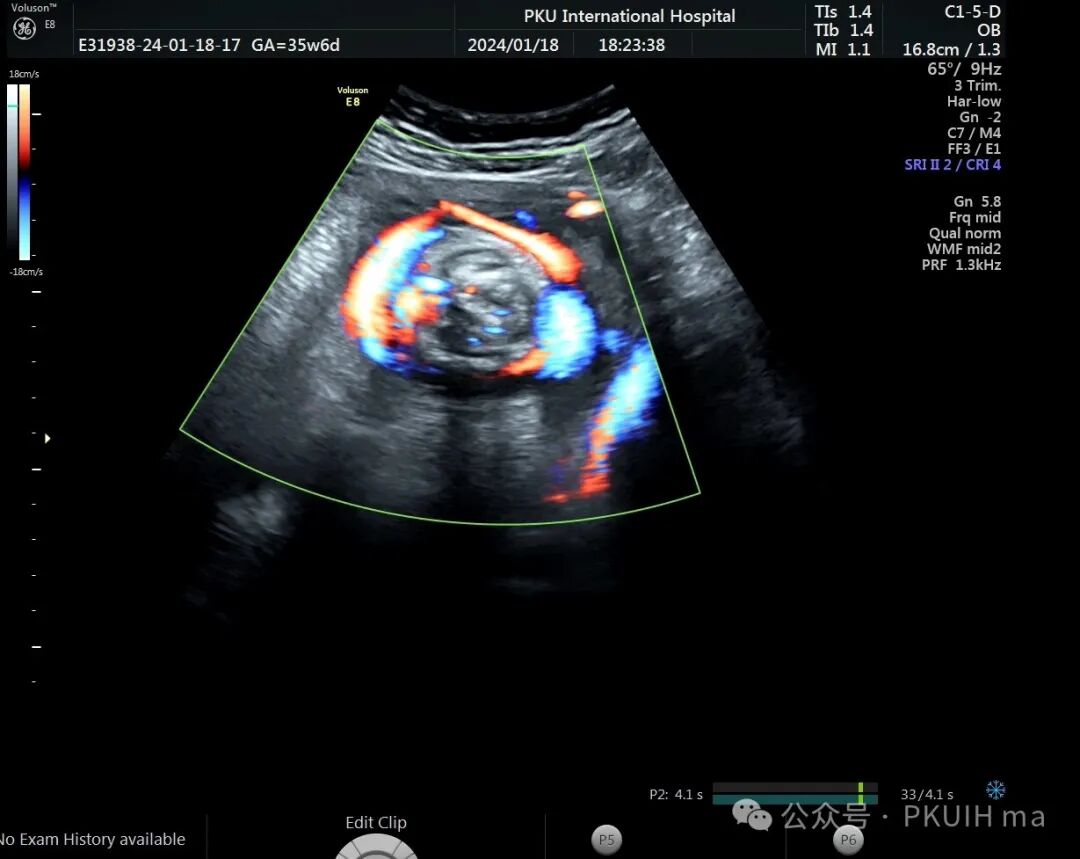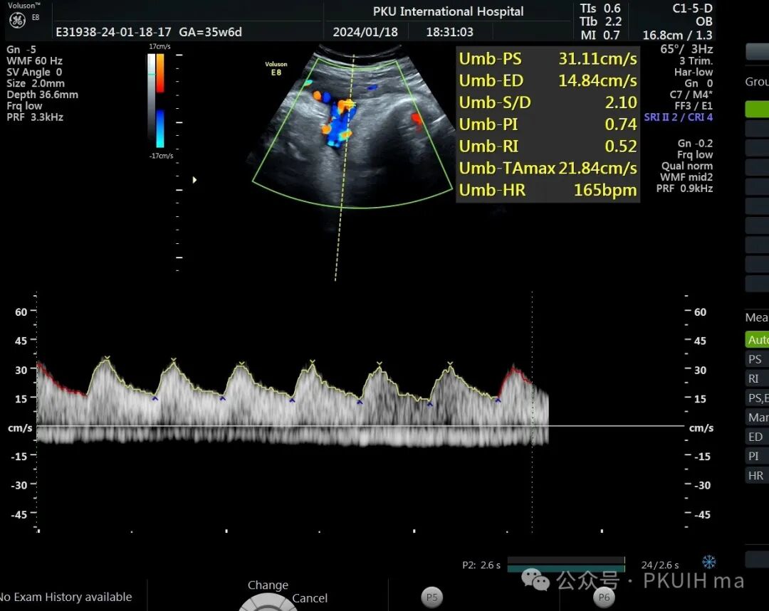 脐带绕颈两周以上,绕的特别紧,感觉脖子都被勒细了,脐带与皮肤之间无任何空隙。绕颈处血流加速时间延长,说明可能存在交锁并出现了脐动脉局部狭窄