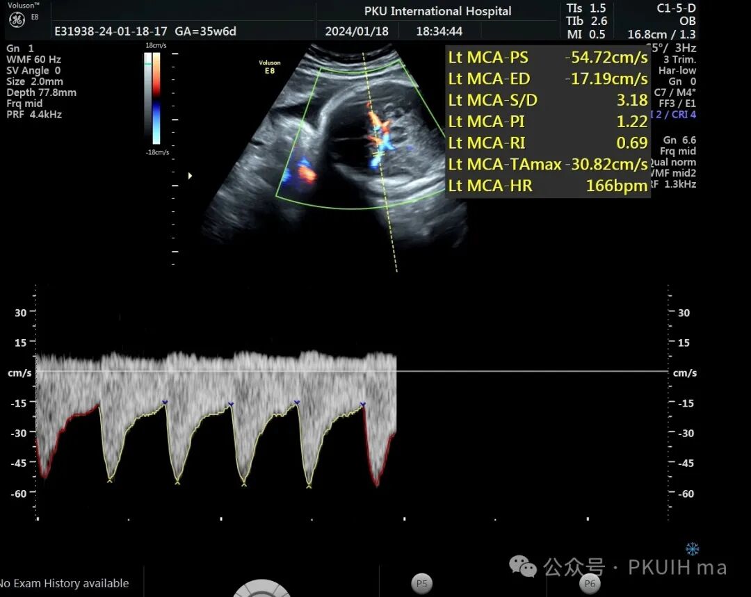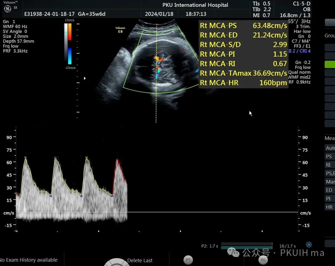 反复测量左右两侧大脑中动脉阻力均低于第五百分位,考虑胎儿存在缺氧