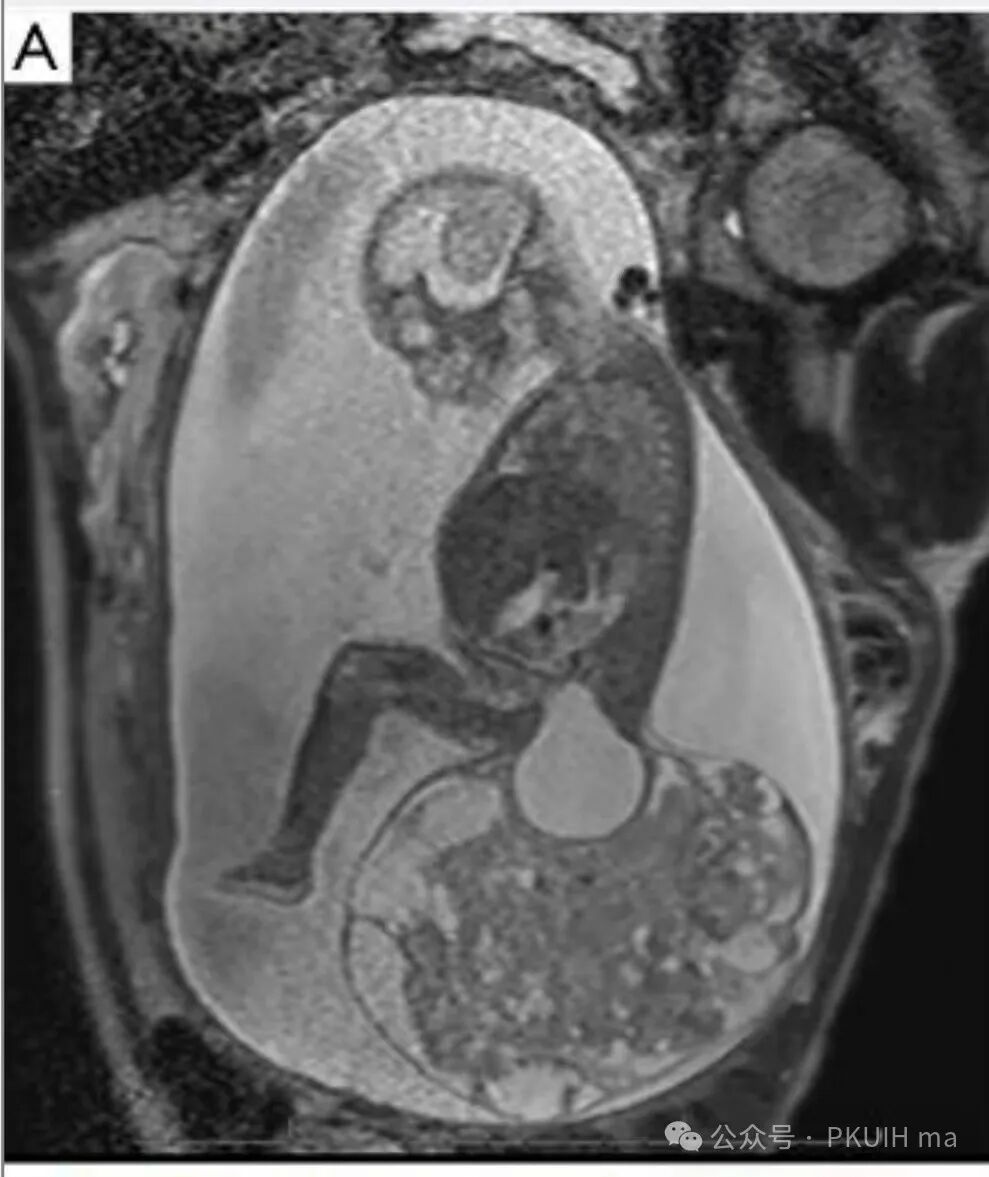 上图是25周胎儿骶尾部巨大畸胎瘤的核磁成像