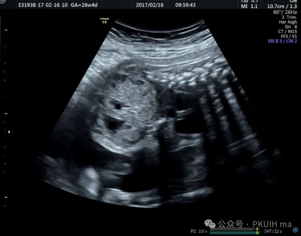 上图是22周系统排畸发现的骶尾部畸胎瘤,随访中发现肿瘤生长过快并血流相对丰富,最后选择了放弃